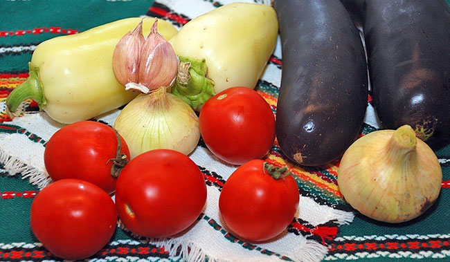 - помідори, цибулю і болгарський перець миємо, чистимо і ріжемо тонкими півкільцями (цибулю і перець — 2 мм в товщину, помідори трохи товстіший — 3 мм);