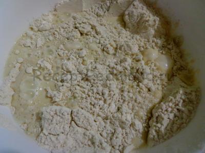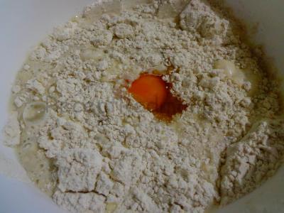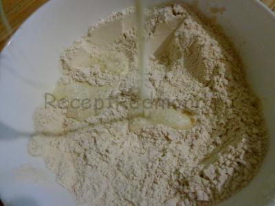 Тонкою цівкою налити молоко, розбити яйце і додати масло.