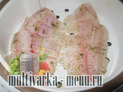 Через 15 хвилин приготування рагу. Нарізаємо промаринованное філе окуня на порційні шматки і кладемо в чашу для пароварки. Ставимо її в каструлю і продовжуємо приготування.