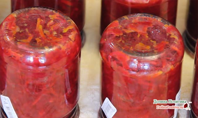 • У банки расфасуйте всю заготовку. Щільно закупорьте кришками. У вас вийде 9 банок по 500 грам. Переверніть ємності на кришки, укутайте ковдрою. А коли заправка охолоне, приберіть в прохолоду.