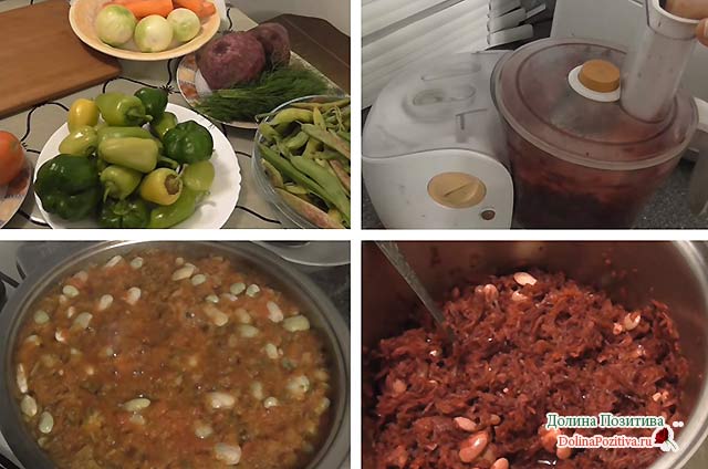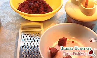 • Подрібніть. Буряк, моркву на тертці. А решта овочі по черзі через м’ясорубку. Використовуйте за бажанням велику або дрібну решітку.