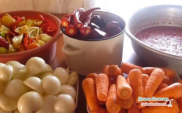 • Почніть з чищення і миття овочів. Після цього приступите до нарізки. Помідори – четвертинками, солодкий перець і буряк – соломкою. Цибуля ріпчаста изрежьте півкільцями, а моркву пропустити через тертку. Нарізку складіть в об’ємну каструлю.