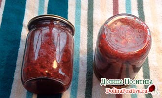 • Викладіть заготовку по банкам (використовуйте 500 або 700-грамові баночки), туго закрутіть кришками.