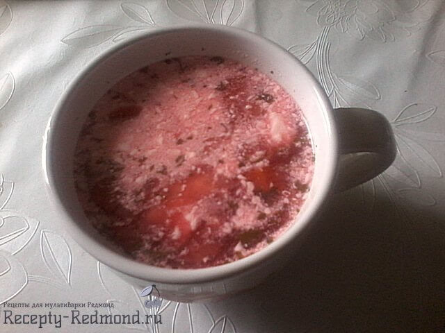 Вибираємо режим «гасіння» і готуємо борщ в мультиварці Редмонд годину. За кілька хвилин до кінця готування додаємо в блюдо подрібнений часник, дрібно порізану помідорки і рубану зелень для аромату і смаку.