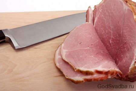 - Шинку нарізаємо на тонкі скибочки. Естетично виглядають бутерброди з одним цільним шматочком окосту або з двома шматками, які повністю закривають батон. При бажанні можна надрізати пластини стегна до середини і красиво згорнути їх на батоні, наприклад, у формі чаші або куреня. Всередину або з боків отриманої фігури помістити нарізану таким же способом помідор і гілочку зелені. Тут можна проявити фантазію і перетворити звичайні бутерброди в справжній шедевр кулінарного мистецтва.