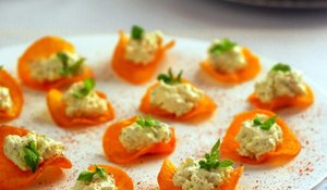 Оригінально виглядає закуска, подана на чіпсах. Для начинки подрібнюють помідори без шкірки, зелену цибулю, кінзу, сир. Всі інгредієнти змішують і заправляють густою сметаною. Суміш викладають на чіпси. Закуска виходить хрустка і дуже апетитна, подається на великому плоскому блюді.