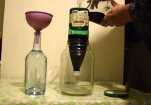 шийку вийшла саморобної лійки закрити ватою. Вату при бажанні можна загорнути в шар марлі. Викладаємо шар вугілля на вату, кількість його повинна складати 55 г на літр самогону і пропускаємо самогон через цей фільтр, його можна прогнати через нього кілька разів. Щоб добитися ідеального результату краще кожен раз міняти вугілля на новий.
