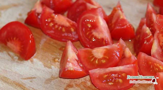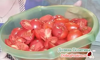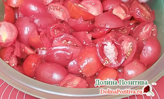 Помідори миємо й нарізаємо половинками, плодоніжки прибираємо.
