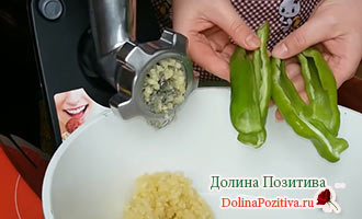 Часник чистимо від лушпиння, а чилі від насіння. Пропускаємо через м’ясорубку зубчики, перці, потім томати.