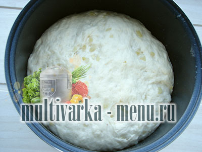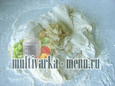 Тепер викладаємо пишне тісто на робочу поверхню, посипану борошном. Обминаємо його спочатку без начинки. А потім в середину тіста невеликими порціями кладемо цибулю. Обминаємо тісто ще, щоб лук опинився всередині. Таким чином, вводимо цибулю поступово в тісто. Якщо він виявився зовні, нічого страшного.