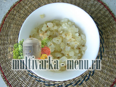 А поки обсмажимо цибулю в рослинній олії. Я це роблю прямо в мультиварці на режимі СМАЖЕННЯ. Час приготування цибулі індивідуальне. Коли він стане золотистим, тоді і відключаємо програму.