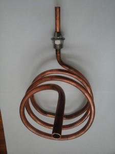 Для його виготовлення, треба спочатку повністю набити люльку піском – це необхідно для того, щоб при згинанні не пошкодити стінки. Далі, затиснувши один кінець трубки плоскогубцями, її навивають на круглий предмет відповідного діаметру. Розмір змійовика повинен дозволяти пристрою знаходиться в корпусі холодильника з зазором між стінками пристосувань від 5 до 10 мм – це необхідно для протоку води.