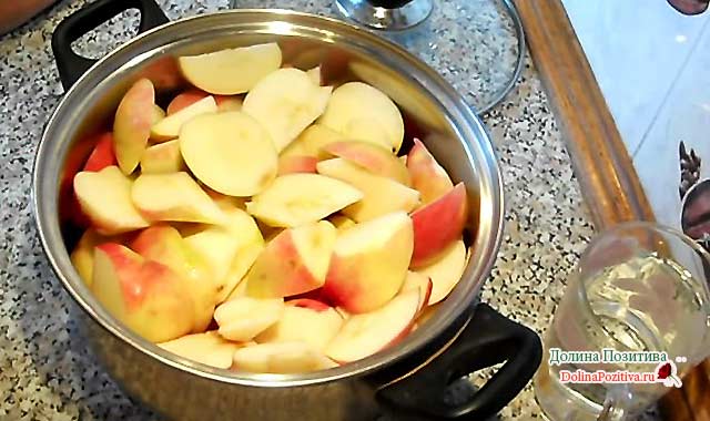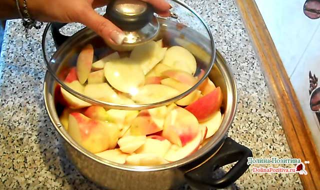 Каструлю з яблуками поставте на вогонь. Додайте 1 склянку води. Варіть 15-20 хвилин, фрукти стануть м’якими. У вас є пароварка? Зваріть райки над парою.