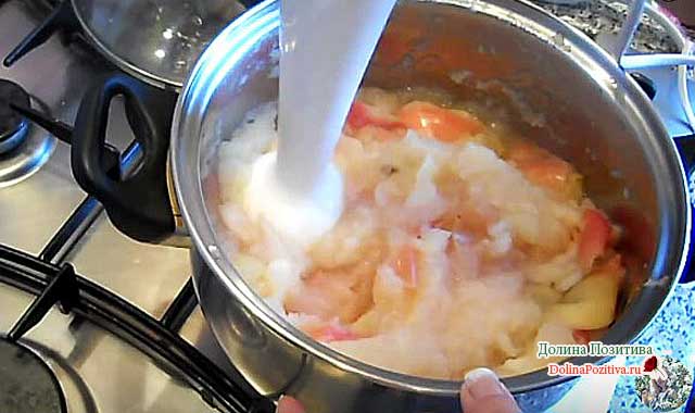 Через 20 хвилин воду, в якій варилися яблучка, зливаємо в склянку. Він ще стане в нагоді. Подрібнюємо відварені фрукти блендером. Відставляємо пюре в бік.