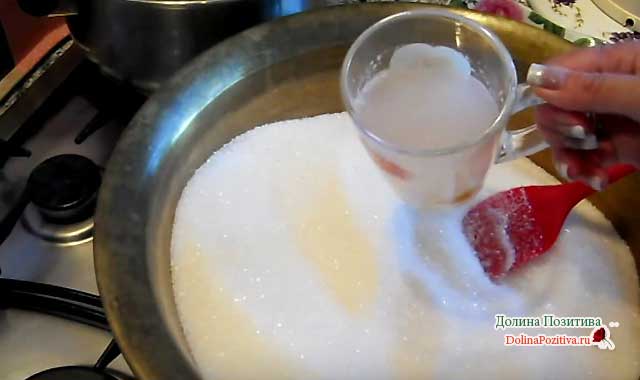 В інший посуд висипаємо цукор. Фрукти солодкі? Додавайте цукор в пропорції один до одного. В цукровий пісок виливаємо воду, в якій скніли фрукти.
