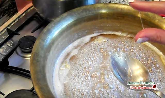 Варимо сироп, поки він не загусне. Час приготування — 15-20 хвилин після закипання на помірному вогні. Сироп вийде світлого кольору, а не карамельного. Перетравлювати не треба. Солодкий сироп постійно помішуйте.