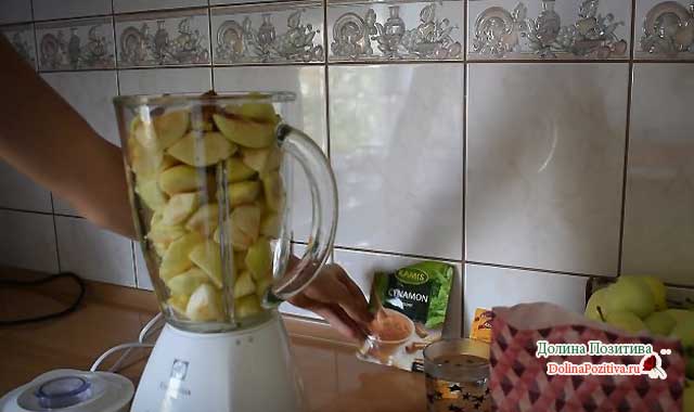 Наповнюємо ємність від блендера фруктами, додаємо корицю, пакетик ванільного цукру і 0,5 склянки води. Включаємо блендер.