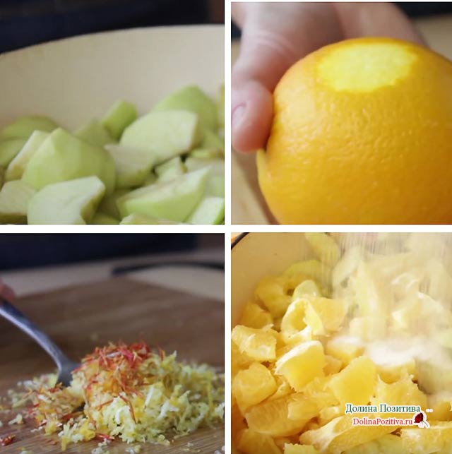 До цедри лимона і апельсина додаємо прянощі грузинської кухні імеретинський шафран для кольору. Протерту цедру з прянощами відправляємо до яблук.