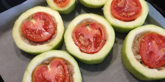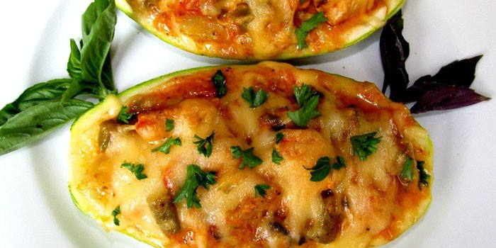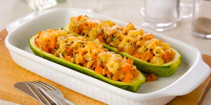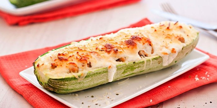 Чергова варіація страви, яка повинна сподобатися всім прихильникам дієтичного харчування. Кабачки, фаршировані овочами, містять мало калорій. Рецепт ви можете коректувати самостійно. Для начинки підійдуть будь-які овочі, крім тих, що зазначені в складі: баклажани, білокачанна капуста, брокколі. Подається страва під сметанною заливкою і сирною скоринкою, але не можете додавати ці компоненти, якщо хочете зробити його легше.