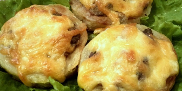 Наступне блюдо виходить дуже незвичайним. Кабачки, фаршировані м’ясом в духовці готуються в спеціальній паніровці, що позитивно впливає на їх зовнішній вигляд. На фото видно, наскільки красивими вони виходять. В якості начинки виступає не м’ясний фарш, а шматочки курячого філе, попередньо протушкувалися. Овоч перед запіканням недовго відварюється.