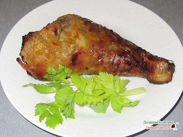 Розігріваємо духовку до 200 градусів. Відправляємо гомілки запікатися, зменшуємо температуру до 180 градусів. Випікаємо півгодини.