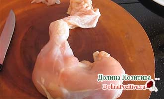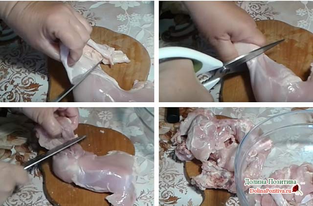 Знімаємо акуратно шкірку із стегенець, поддевом ножем. Кінець ніжки подрубаем. Намагаємося нічого не порвати. Обрізаємо зайві виступи з верхньої частини. М’ясо відокремлюємо від кісток і перекручуємо на м’ясорубці. Фарш приправляємо за смаком.