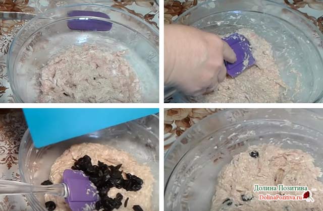 Чорнослив з курагою розрізаємо на невеликі шматочки і вводимо в фарш. Начиняємо масою порожні торбинки з шкірки. Закриваємо краю.
