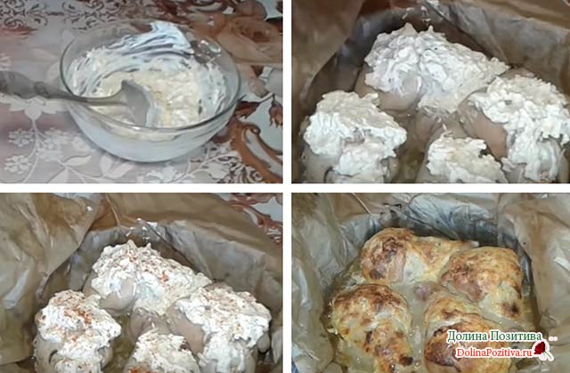 Приправляємо за бажанням. За 10 хвилин до кінця дістаємо блюдо. Промазуємо сирно-сметанною масою. Вийде рум’яна і смачна скоринка. Відправляємо назад гомілки під соусом в духовку. Випікаємо до готовності.