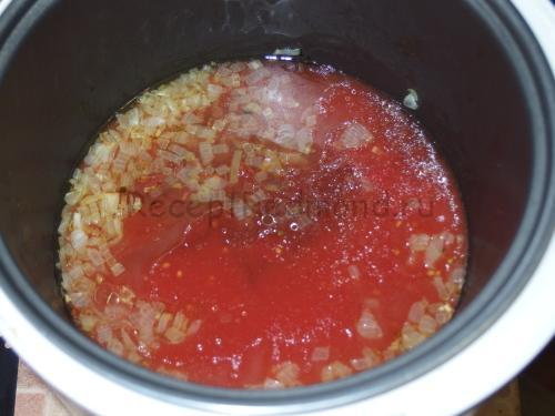 Увімкніть мультиварку на режимі «смаження» і приготуйте томатний соус — обсмажте цибулю і протушкувати трохи його в томаті. Не забудьте посолити.