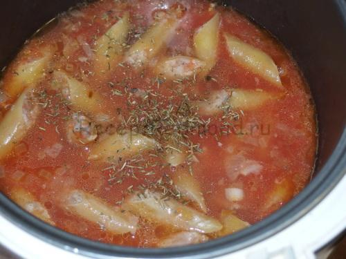 Потім влийте чашку води (330 мл) і 50 гр червоного вина, перемішайте і додайте туди макарони, фаршировані сирим фаршем. Закрийте кришку і за час гасіння не забудьте кілька разів перемішати блюдо.