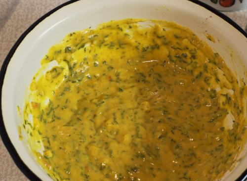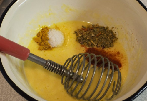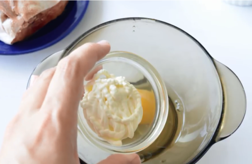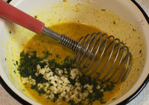- Додаємо майонез, імбир, паприку, майонез. Розбиваємо туди яйце. Інтенсивно перемішуємо вінчиком.