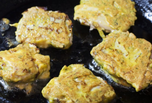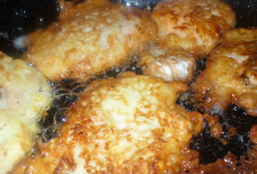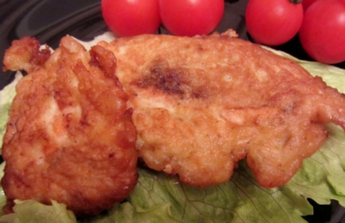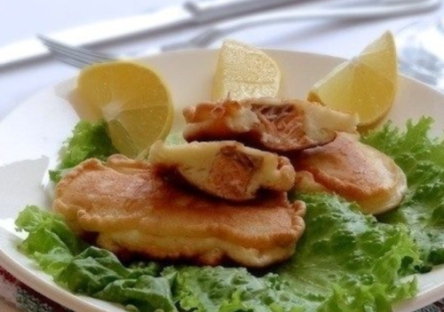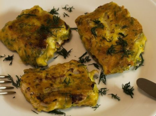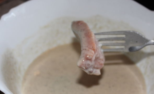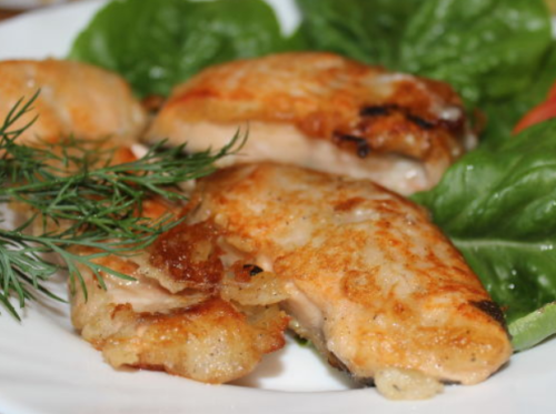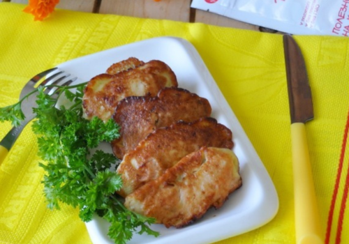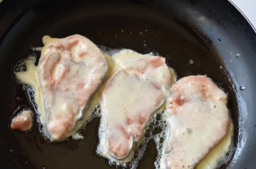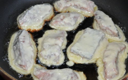 - Занурюємо в нього шматочки основного продукту, потім смажимо на розжареній олії з обох сторін.