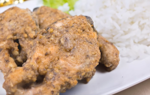 - Видаляємо з тушки шкіру, кістки, ріжемо порційно. Заправляємо перцем, сіллю. Поки відставляємо.