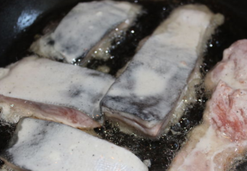 - Шматочки риби вмочаємо і викладаємо на розігріту сковороду з маслом.