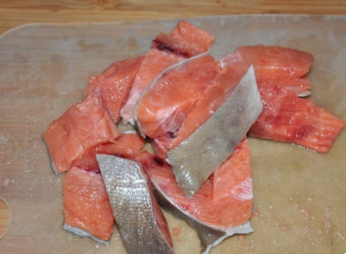 - З горбуші виймаємо кістки, ріжемо її порційними шматками.
