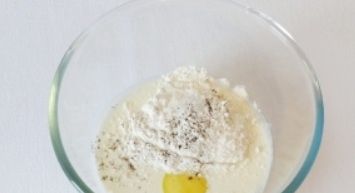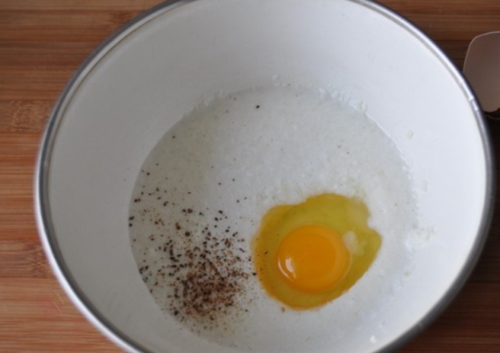 - Отриману масу перелити в іншу ємність, перчимо, солимо, розбиваємо яйце. Збиваємо за допомогою віночка.