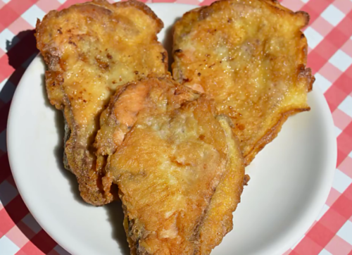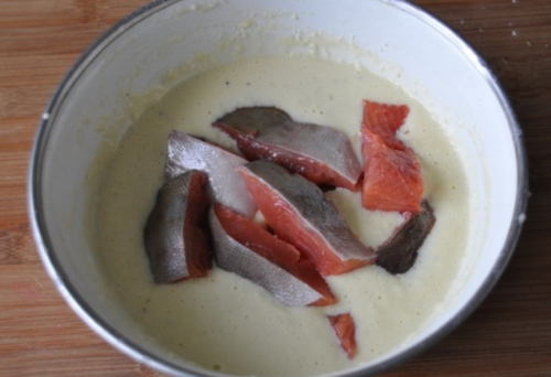 - Горбушу ріжемо, обсушуємо, рясно солимо, занурюємо в кляр.