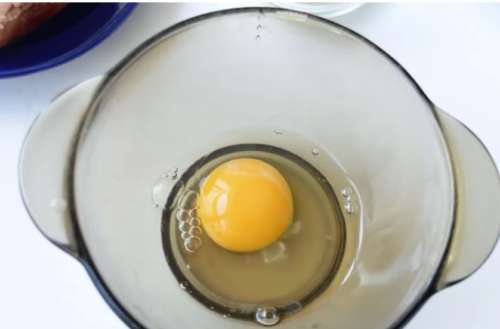 - У глибокій тарілці розбиваємо яйце, вливаємо до нього кефір.