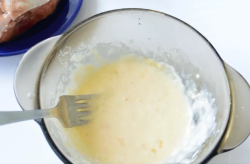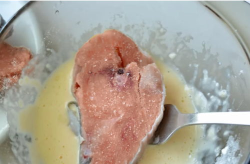 Консистенція кляру для горбуші в цьому рецепті з покроковими фото повинна бути однорідною, тягнеться, але при цьому не надто густий. Інакше при смаженні на сковороді він стане товстим, пористим і не пропускатиме масло.