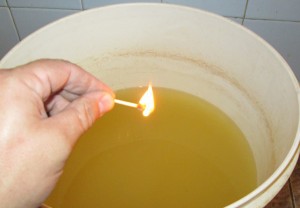 В процесі бродіння відбувається активне виділення вуглекислого газу, який пригнічує кисень. В домашніх умовах визначити завершення цього етапу можна за допомогою запаленого сірника. Якщо при піднесенні полум’я гасне, значить, вироблення вуглекислого газу продовжує і бразі ще треба постояти, і, відповідно, коли горить – то сировина готова.