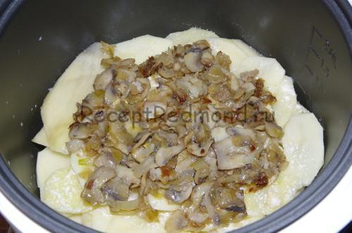Продовжуйте чергування сиру і овочів, поки не закінчиться картопля, єдине, в середину викладіть смажені гриби.