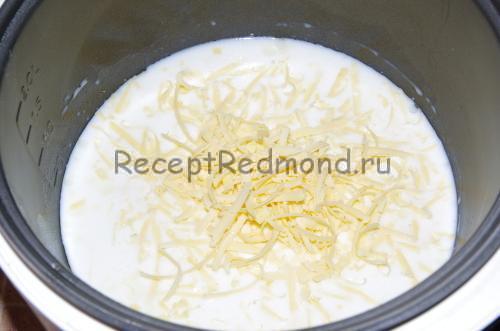Увімкніть режим «смаження» і нагрійте вершки, але не до кипіння. Натріть на крупній тертці сир і завантажте 23 його в чашу мультиварки. Помішуючи дерев’яною лопаткою, дочекайтеся, поки сир повністю не розчиниться. Зніміть контейнер, додайте мускатний горіх і через кілька хвилин видавити туди часник. Чим більше соус охолоне, тим більш вираженим буде часниковий аромат в кінці.