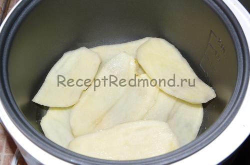 Налийте олію на дно мультиварки і починайте викладати картоплю. Покривши одним шаром повністю, полийте слайсы сирним соусом.