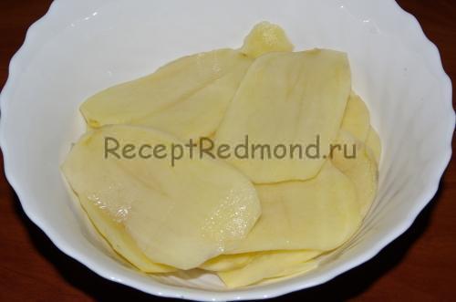 Картопля беріть того сорту, який не розварюється швидко — так запіканка не розпадеться.Бульби повинні бути середніми або великими, а товщина нарізки їх не більше 3 міліметрів.Інгредієнти