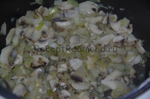 Першим ділом обсмажте гриби на рослинній олії. У режимі «смаження» 15 хвилин буде цілком достатньо.