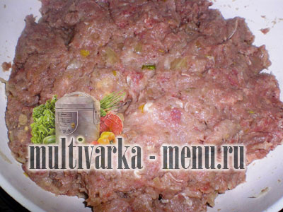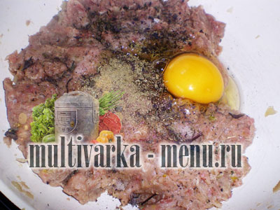 Додаємо у фарш яйце, солимо і висипаємо всі спеції.