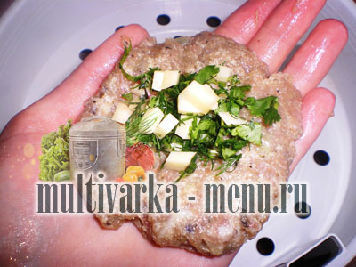 Фарш ми замісили. Ставимо чашу для пароварки. Робимо коржик з фаршу мокрими руками і чайною ложкою кладемо начинку посередині.