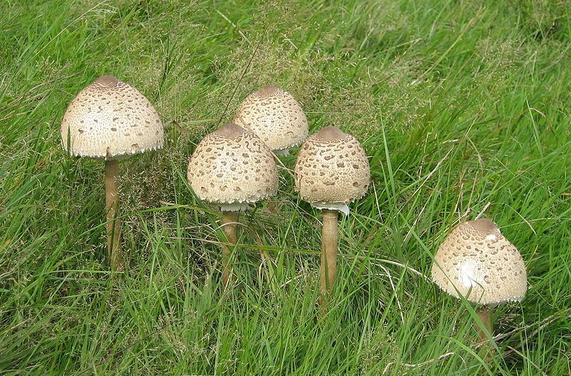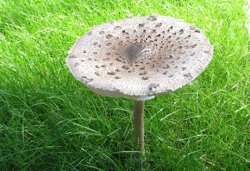Парасолька строкатий. Такий парасольку складно не помітити і пройти повз: він великий (рис.3). Діаметр капелюшка досягає 38 см, на білому фоні утворюються сіро-коричневі волокнисті лусочки. Форма капелюшка кулю у молоденького гриба розкривається в конус з віком. У центрі розташований темний бугорочек, а краї загинаються всередину. Основа-ніжка коричневого кольору з кільцем з дрібних лусочок. М’якоть рыхловатая зі специфічним вираженим ароматом. Парасолька великий за смаковими якостями наближається до печерицям.