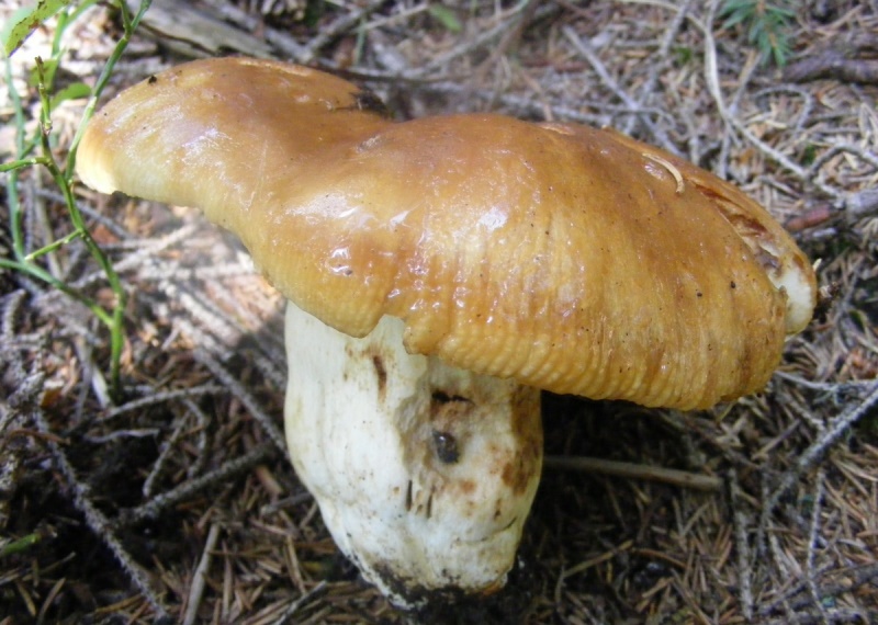 Опис гриба варто почати з верхньої частини — капелюшки. У молодих представників вона майже куляста, слизька, край плодового тіла загнуті до ніжці. Колір спорообразующей частини гриба жовто-бурий. У процесі дорослішання капелюх рослини збільшується в обсязі до 15 см, стає прямої, з часом краї капелюха набувають невеликі розсічення.