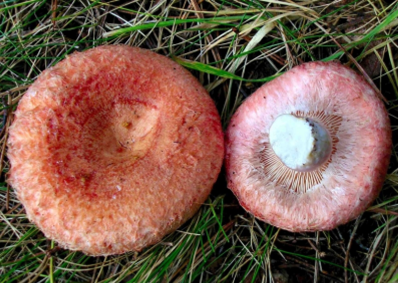 Діаметр капелюшка досягає 12-14 см, її колір приємно рожевий. Молоді грибочки відрізняються опуклої капелюшком, по мірі зростання її форма змінюється на плоску, з невеликим поглибленням. Капелюшок великої вовнянки схожа з лійкою, її верхню частину прикрашають невеликі ворсинки. Вони розташовані по колах. Знизу капелюшки є тонкі пластини кремового відтінку. Дана частина тіла дуже тендітна. Лісовий продукт при розрізі виділяє слабовиражений смолянистый аромат, на смак сире тіло гірчить. Молочні судини рожевий можна відшукати близько їстівних грибних сімей, рослина любить березове сусідство.